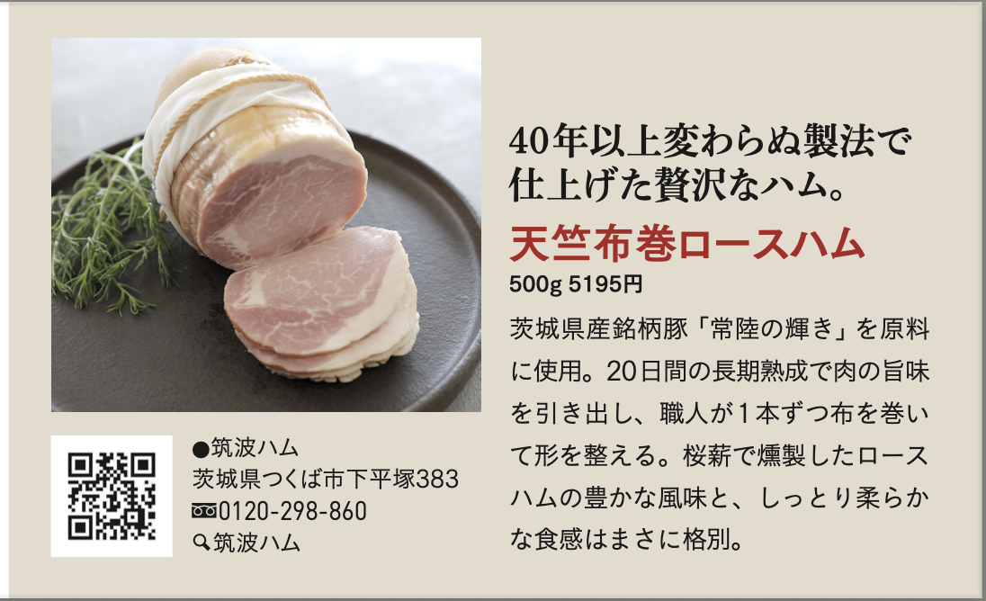誌面では、筑波ハムの代表商品「天竺布巻ロースハム」 を取り上げていただき、ご紹介いただいています。