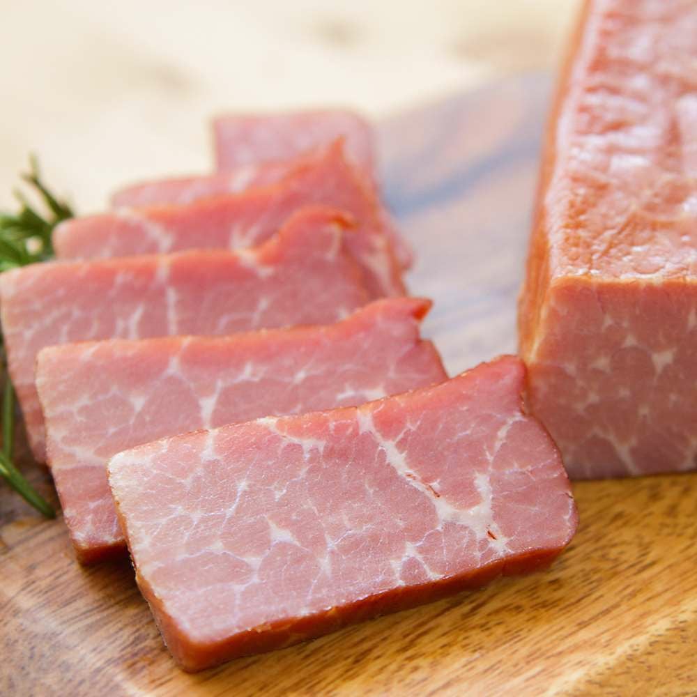 ロースハム、ボンレスハムを通常販売サイズより大きく作った特注サイズのハムやしんたま骨付きハムを特製桐箱に入れ、お届けけいたします。