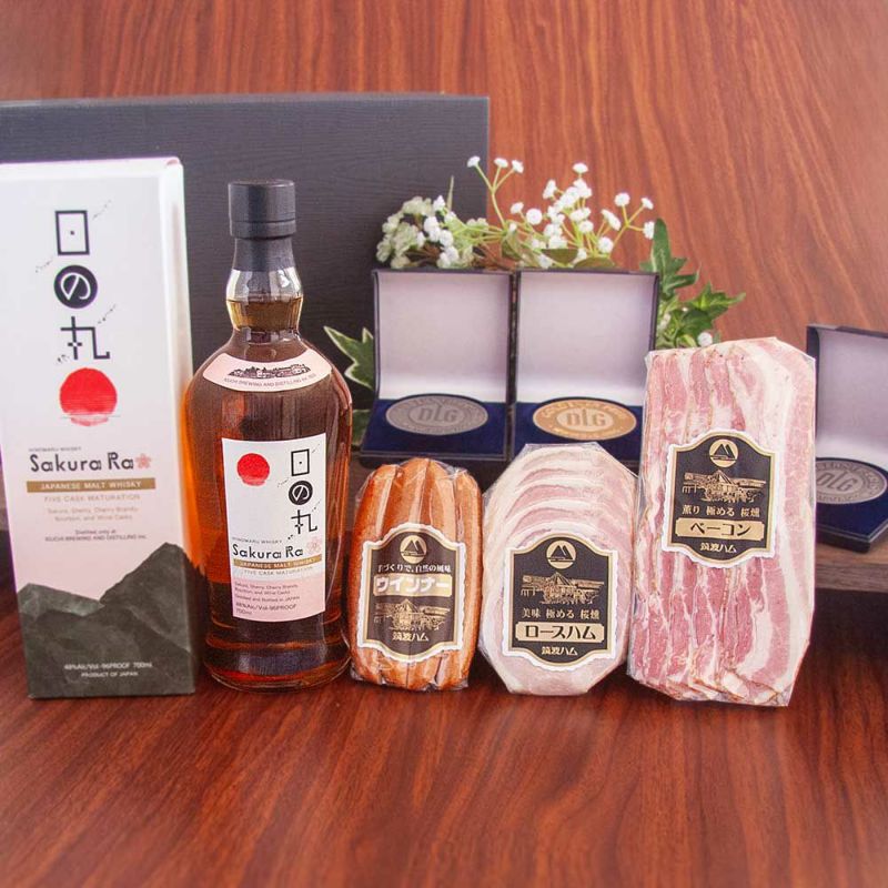 日本を象徴する桜をイメージしたジャパニーズモルトウイスキーとDLGコンテスト金賞受賞ロースハムと銀賞受賞ベーコン、ウィンナーの詰め合わせ。