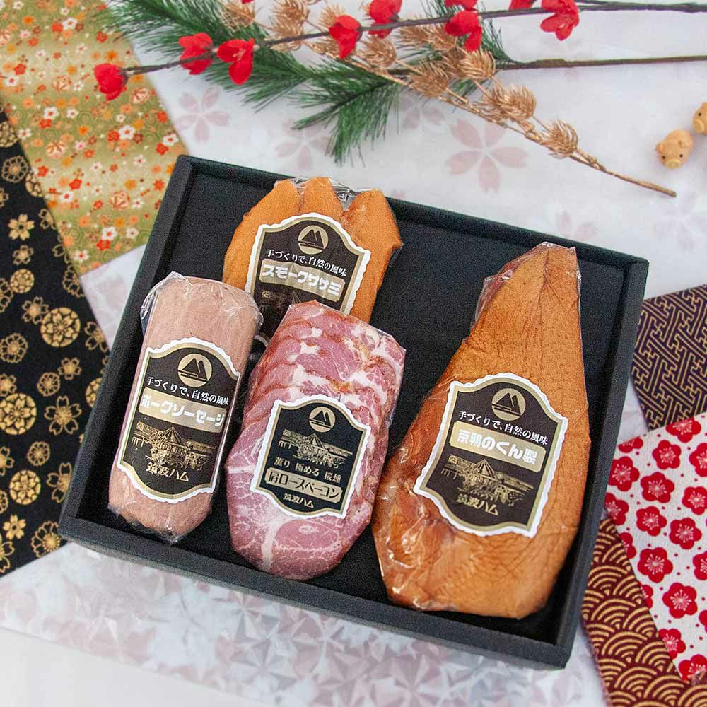 おいしい贈り物の定番ハムを中心としたセット、クリスマスの食卓にもおすすめのスモークチキンを中心としたセット、人気の飲むヨーグルトを詰め合わせたセットのほか、クラフトビールや純米酒、純米大吟醸、しゅわしゅわっとのど越し楽しい微発泡酒、コンテスト受賞の日の丸ウィスキーとハム、ベーコン、ソーセージを詰め合わせたセットをご用意しました。