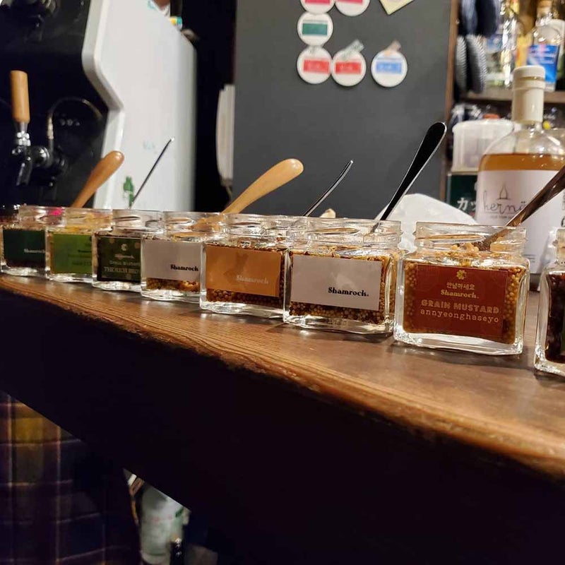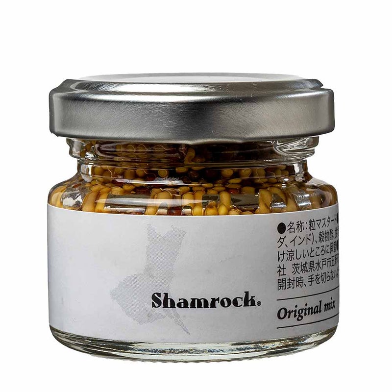 お店で提供する料理に合わせ、「理想のマスタードを」 茨城県水戸市のビールバー「Shamrock」で「料理に本当に合うマスタードを」と手作りから生まれた、こだわりの一品。 ぷちぷちとはじける食感と、奥行きのある香り。 香り高く辛味の効いたインド産ブラウンマスタードと、やさしい風味のカナダ産イエローマスタードをブレンドした、肉の旨みを引き立てるための粒マスタード。